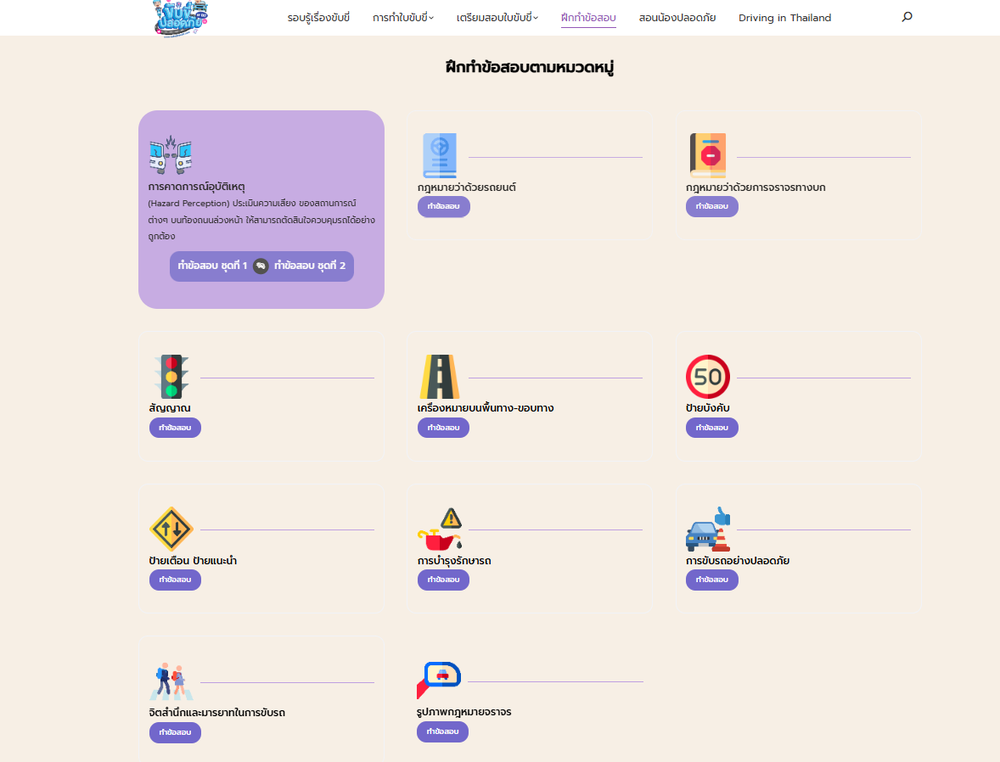 เว็บฝึกทำข้อสอบใบขับขี่อีกอันที่น่าสนใจ คือ thaidriveexam.com แนวข้อสอบเหมือนกับที่ขนส่งออกสอบเลย สามารถทำวนไปจนกว่าจะได้ 100 คะแนน มีครบทุกหมวด ได้แก่ ป้ายและเครื่องหมายจราจร, กฏหมายจราจร, การขับขี่และการดูแลรักษา, การคาดการณ์อุบัติเหตุ และข้อสอบแบบสุ่ม 50 ข้อ บอกเลยว่าปังมาก ไม่ได้คะแนนเต็มให้มันรู้ไป