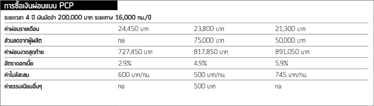 XC40 เป็นตัวเลือกที่ถูกที่สุดเมื่อคุณวางแผนจะซื้อผ่านระบบผ่อนแบบ PCP โดยการวางมัดจำ 200,000 บาท ผ่อน 4 ปี (จำกัดระยะวิ่งไม่เกิน 10,000 กิโลเมตรต่อปี) คุณจะมีภาระผ่อน 21,300 ต่อเดือน ซึ่งราคาถูกกว่าอีก 2 รุ่น