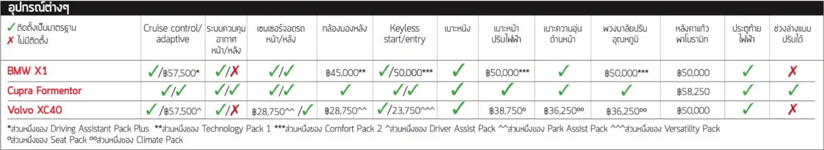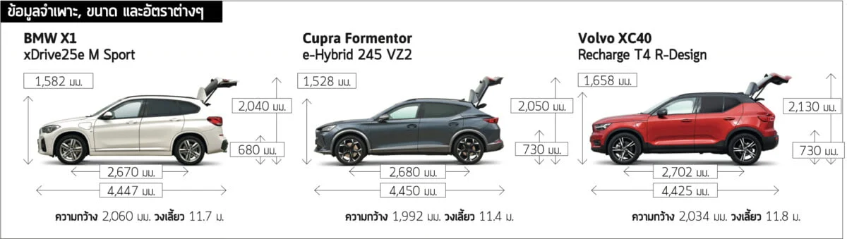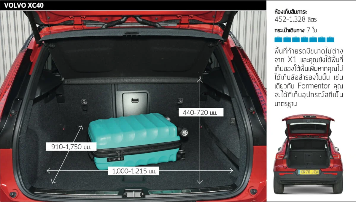 หากพื้นที่วางขาคือเรื่องสำคัญ คุณจะประทับใจ X1 ตามด้วย Formentor เพราะทั้งคู่มีพื้นที่เหนือศีรษะที่น่าพอใจ แต่หากคุณไม่ใช่ผู้โดยสารสูงกว่า 180 ซม. คุณจะสามารถโดยสาร XC40 ที่มีภายในกว้างขวางได้อย่างสบายใจ อีกทั้งมันยังมาพร้อมกล่องอเนกประสงค์ข้างประตูที่มีการบุกันกระแทก