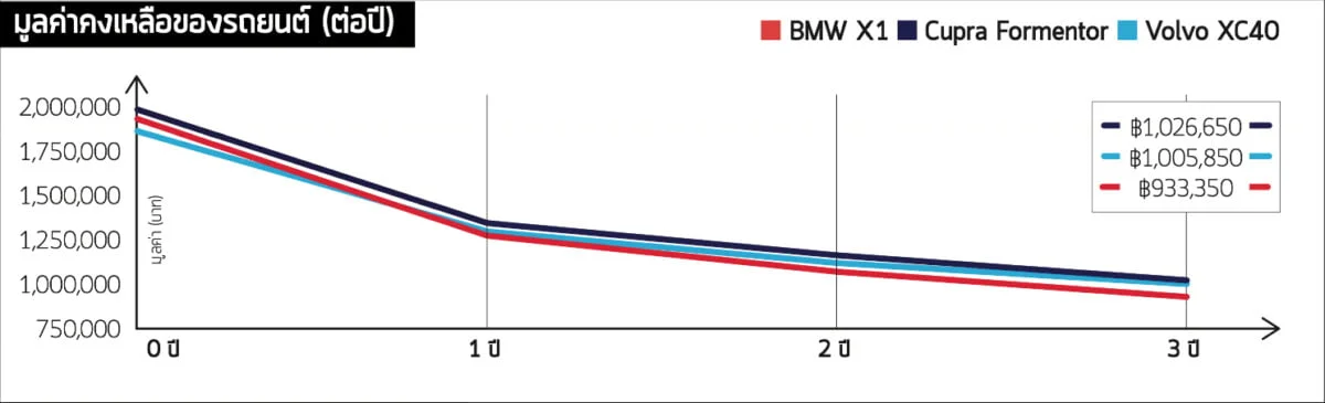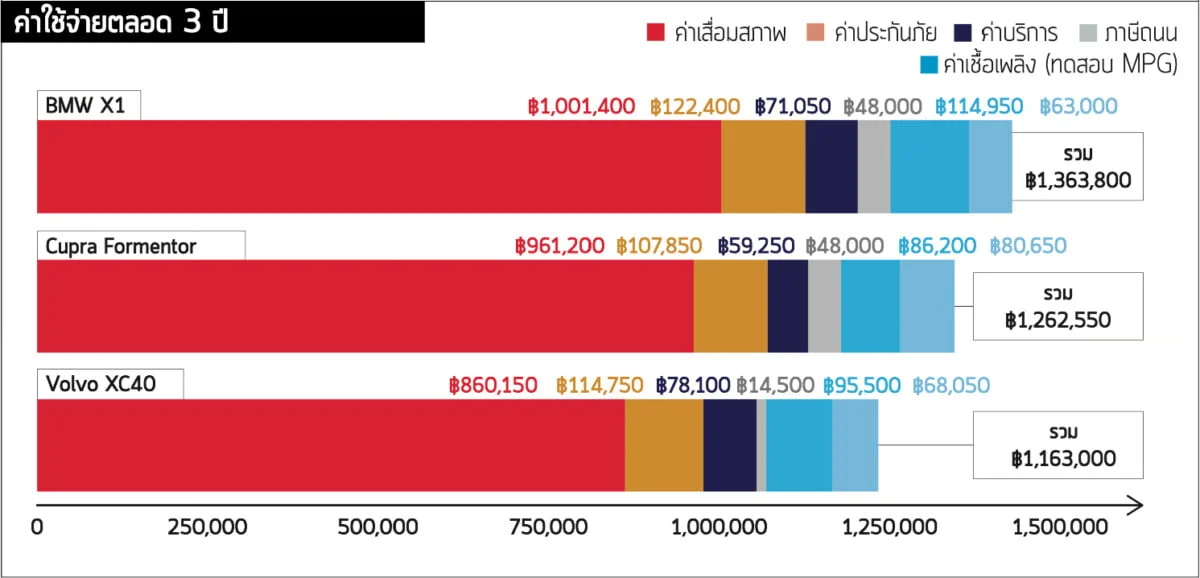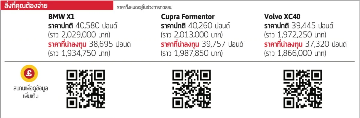 ทั้ง ๆ ที่เป็นรถยนต์ที่ช้าที่สุดในทั้งสามรุ่น แต่ XC40 ก็ผลิต CO2 มากที่สุด และสามารถวิ่งด้วยไฟฟ้าล้วนได้เพียง 48.26 กิโลเมตร อีกทั้งอยู่ในเกณฑ์อัตราภาษี BIX 40% นั้นหมายความว่าคุณจะมีค่าใช้จ่ายต่อเดือนมากกว่า X1 และ Formentorประมาณ 1,000 บาทต่อเดือน