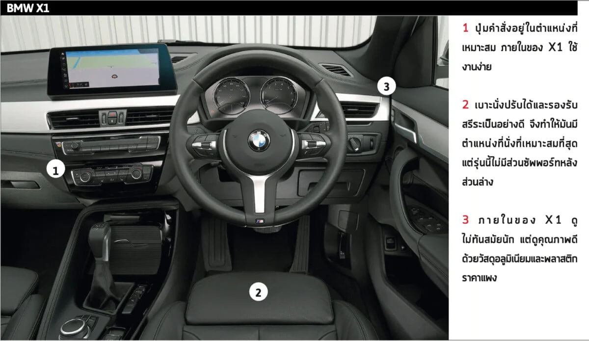 ไม่ต้องสนใจการปรับแบบไฟฟ้า เพราะ X1 ไม่มีแม้กระทั่งส่วนซัพพอร์ทหลังส่วนล่างแบบปรับได้ และเป็นรุ่นเดียวจากในกลุ่ม (สามารถติดตั้งเพิ่มได้ 11,500 บาท) นอกจากนั้นคันเร่งยังค่อนไปทางขวา แต่ในทางกลับกันคุณสามารถปรับพวงมาลัยได้มากที่สุด แม้กระทั่งผู้ทดสอบที่ตัวสูงที่สุดยังสามารถปรับตำแหน่งพวงมาลัยให้เหมาะสมกับเขาได้