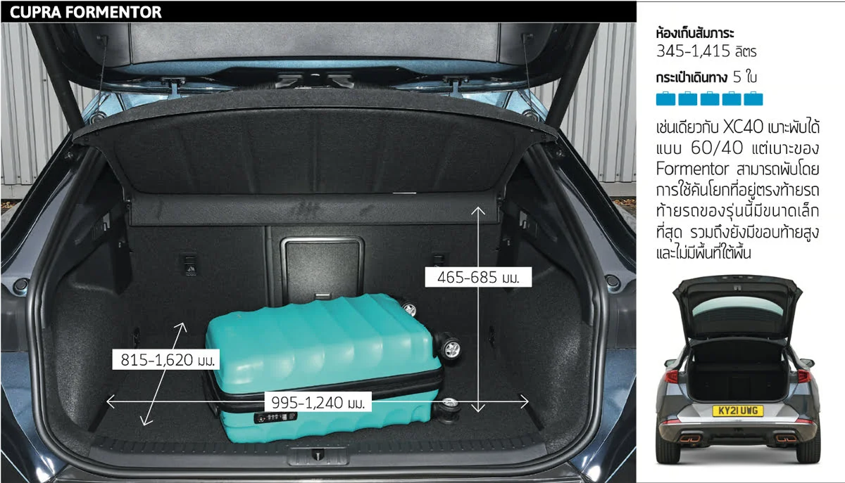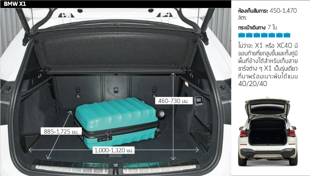 หากพูดถึงท้ายรถ Formentor มีขอบท้ายรถที่สูงที่สุดและมีพื้นที่น้อยที่สุด คุณสามารถจุกระเป๋าเดินทางแบบ carry-on ได้เพียง 5 ใบ อีกทั้งยังไม่มีพื้นที่สำหรับเก็บสายไฟใต้ท้องรถ จึงต้องใช้พื้นที่ร่วมกัน แต่ทั้ง X1 และ XC40 มีพื้นที่สำหรับเก็บสายไฟใต้พื้น (รวมถึงล้อสำรองสำหรับ XC40 ในราคา 7,500 บาท) รถยนต์ทั้งสองรุ่นสามารถจุกระเป๋าเดินทางได้ 7 ใบ