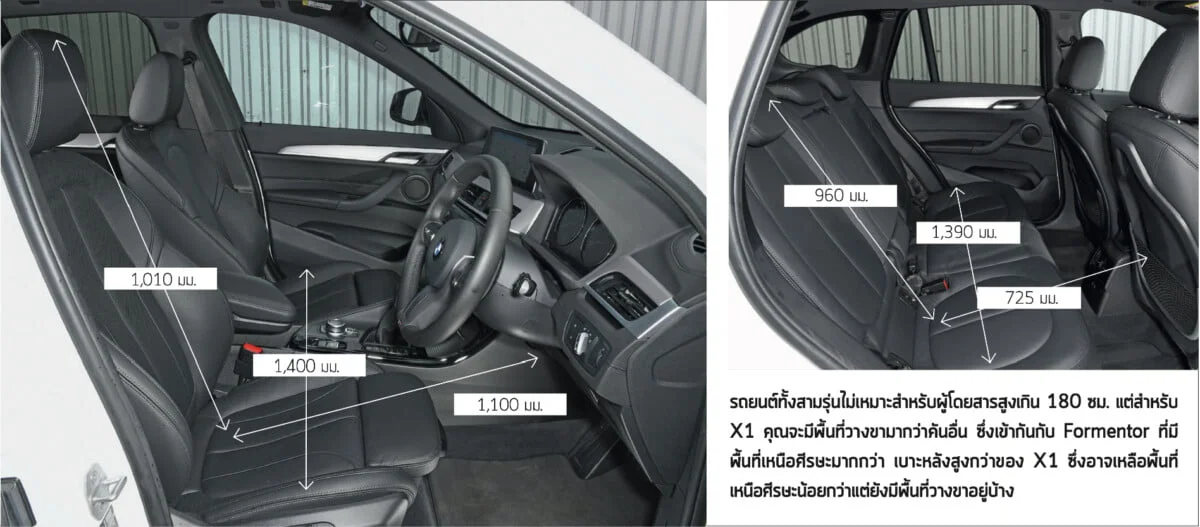 แม้ X1 จะมีขนาดใหญ่กว่าหลายเซนติเมตร แต่มันกลับเหลือพื้นที่เหนือศีรษะน้อยที่สุด เบาะหลังยกสูงกว่าเบาะหน้า และผู้โดยสารตัวสูงที่นั่งตรงกลางอาจเกือบจะชมเพดานด้านบน แต่ในแง่ดีนั้น X1 มาพร้อมพื้นเรียบจึงทำให้การเข้าและออกสะดวกมากกว่า
