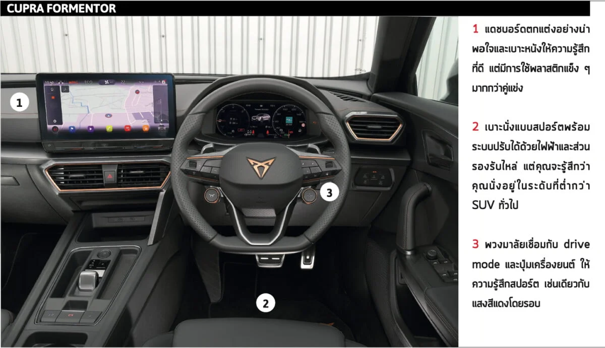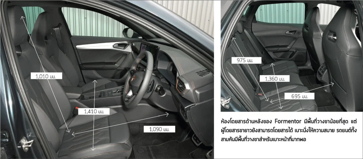 สำหรับความสูง ผู้ทดสอบของเรามีตั้งแต่คนตัวสูง 150 ซม. จนถึง 180 ซม. คุณจะเห็นได้ว่าเรามีการใช้ผู้ทดสอบที่มีความหลากหลาย ผู้ทดสอบที่ตัวเล็กที่สุดของเราให้ความเห็นว่าเบาะของ Formentor หุบเข้าไปด้านในของต้นขามากไป สำหรับผู้ทดสอบที่สูงกว่ามีความเห็นว่าเขามองไม่ค่อยเห็นปุ่มควบคุมจนกว่าจะปรับพวงมาลัยให้สูงกว่าปกติ (ทั้งสามรุ่นมาพร้อมพวงมาลัยปรับได้) แต่ Formentor เป็นรุ่นเดียวที่มีเบาะนั่งปรับได้ด้วยระบบไฟฟ้า และผู้ทดสอบทุกคนมีความเห็นตรงกันว่ามันซัพพอร์ทไหล่ได้ดีที่สุด