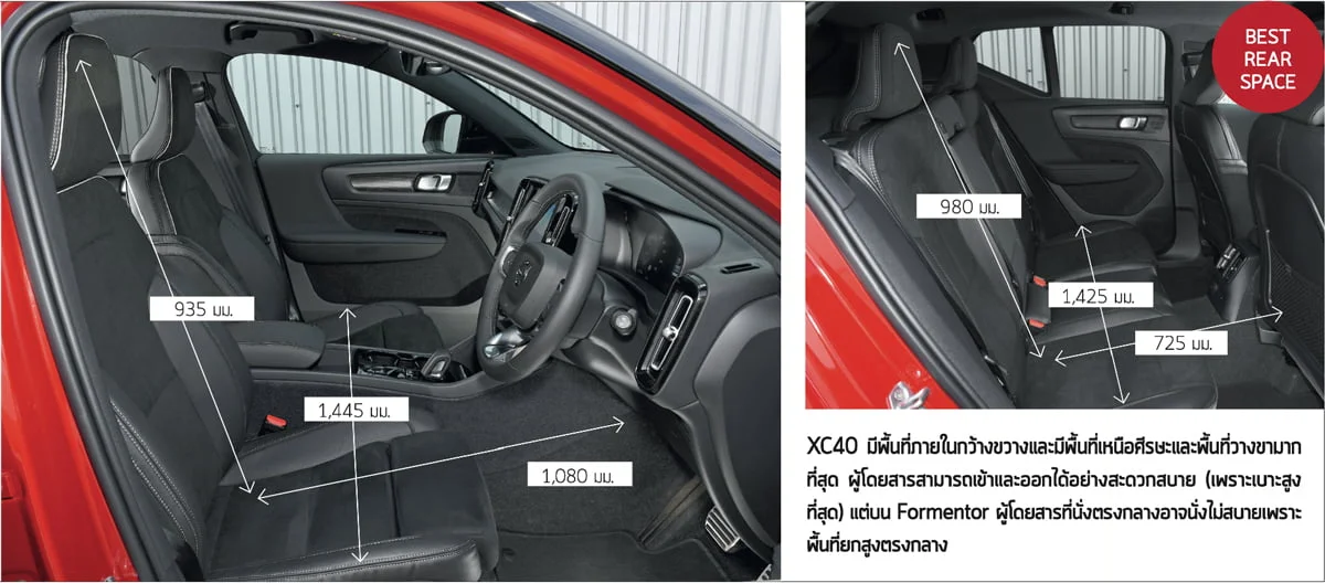 XC40 มีพื้นที่ด้านหลังมากที่สุด มันมีพื้นที่เหนือศีรษะและพื้นที่วางขามากที่สุด (แม้จะเทียบกับ X1) นอกจากนั้นยังมีพื้นที่วางเท้าใต้เบาะหน้ามากที่สุด และนั่นยังหมายความว่าคุณสามารถบรรทุกผู้โดยสารสามคนได้อย่างสบาย ๆ
