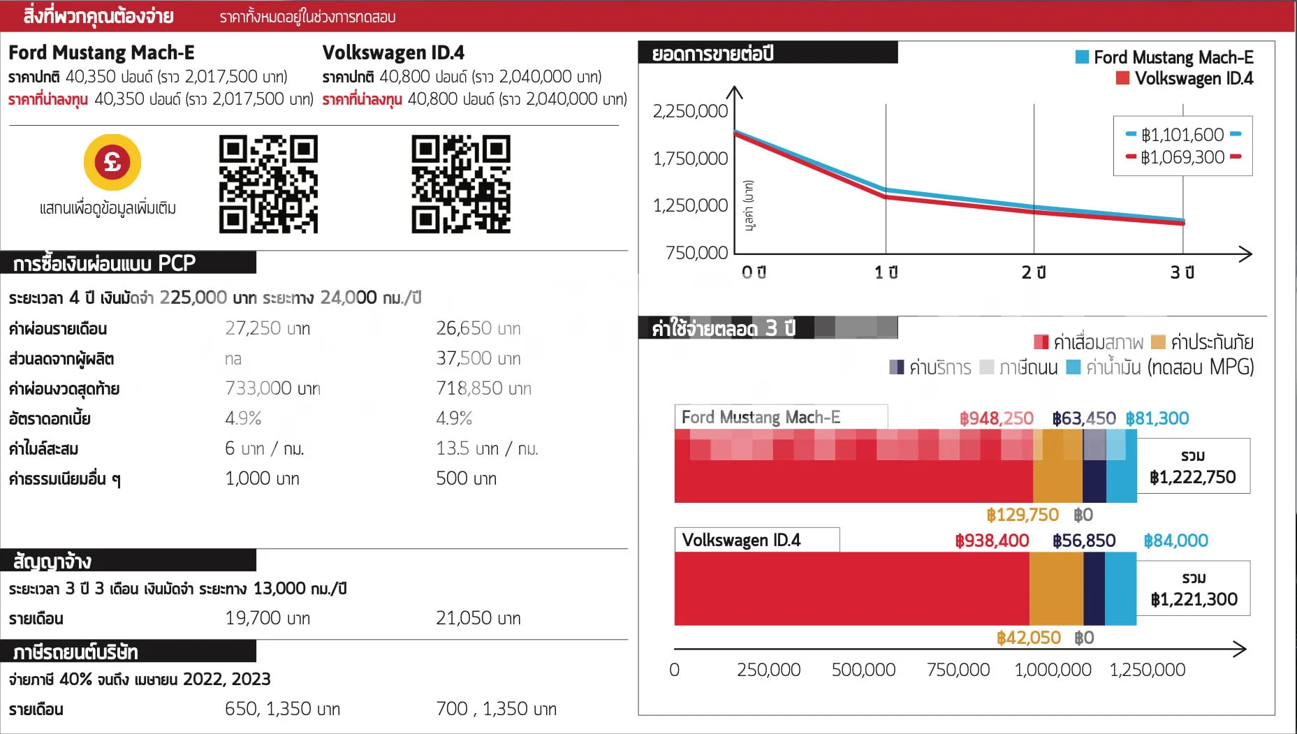 ในตอนนี้คุณอาจจะยังไม่ได้รับส่วนลดและทั้งคู่ไม่ได้รับเงินช่วยจากรัฐบาล ดังนั้นหากคุณซื้อด้วยเงินสดราคาของรถยนต์ทั้งสองแทบจะไม่ต่างกันตลอดสามปี หากคุณซื้อด้วยระบบผ่อนแบบ PCP Mach-E จะมีราคาต่ำกว่าประมาณ 400 บาท ดังนั้นทั้งคู่แทบจะมีราคาไม่ต่างกัน