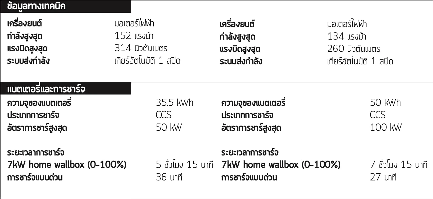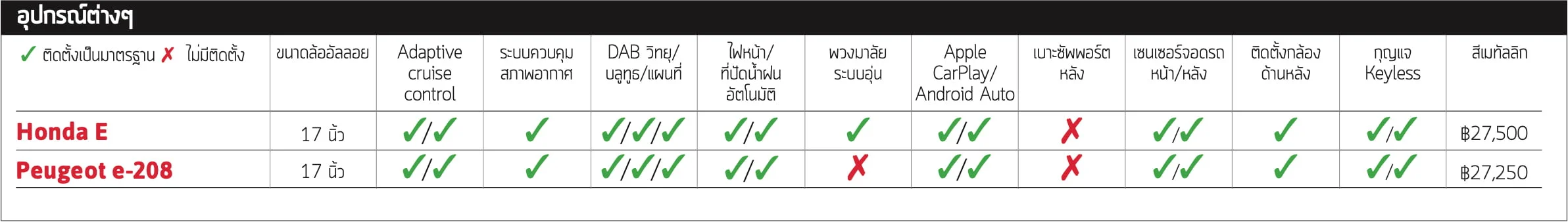 ขึ้น-ลงไร้กุญแจและระบบ cruise control แบบปรับได้ ซึ่งทั้งหมดที่กล่าวมาจะได้รับการติดตั้งเป็นมาตรฐาน อย่างไรก็ตามมีเพียง Peugeot เท่านั้นที่มาพร้อมกับการชาร์จไฟแบบไวที่ปริมาณไฟฟ้า 100kW โดย Honda รับความเร็วไฟฟ้าได้เพียง 50kW เท่านั้น