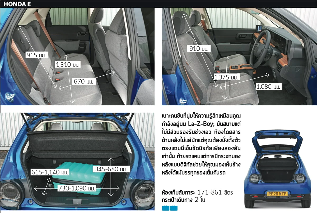 เมื่อพูดถึงการพยายามบีบตัว คำพูดนี้สามารถใช้ได้กับการบรรจุสัมภาระที่ท้ายรถขนาดเล็กของ Honda E เราสามารถจุกระเป๋าเดินทางแบบ carry-on ได้เพียง 2 ใบเท่านั้น ต่างจาก Peugeot ที่ใส่ได้ถึง 5 ใบ คุณสามารถพับเบาะเพื่อเพิ่มพื้นที่ใส่กระเป๋าธรรมดาได้อีกสองสามใบ แต่การพับเป็นไปอย่างลำบาก (ไม่เหมือนการพับแบบ 60/40 ของ Peugeot) หากคุณต้องการจะขนทั้งคนและของพร้อม ๆ กัน Honda อาจไม่ใช่ตัวเลือกที่ดีนัก ผู้โดยสารสักคนหรือของสักชิ้นอาจจะต้องรอที่บ้านแทน