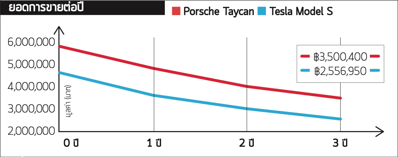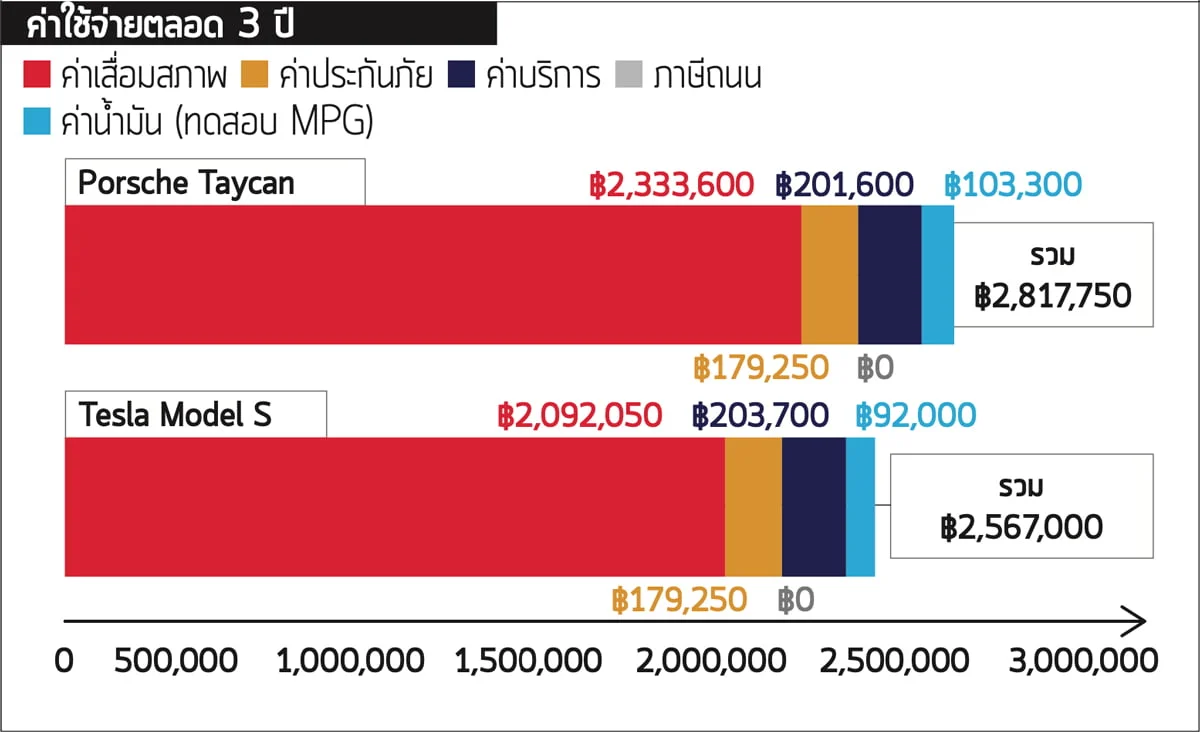 Model S มีราคาถูกกว่ามากเมื่อซื้อด้วยเงินสด แต่โดยภาพรวมแล้วทั้งค่าบริการและค่าประกันเท่ากันถึงแม้เราจะพบว่า Taycan ใช้พลังงานไฟฟ้ามากกว่า ในช่วงสามปีแรกนั้นมีค่าใช้จ่ายเพิ่มขึ้นเพียงไม่กี่ร้อยปอนด์ อันที่จริง Taycan ควรเสียค่าใช้จ่ายรวมเบ็ดเสร็จภายในครั้งเดียวจะดีกว่า