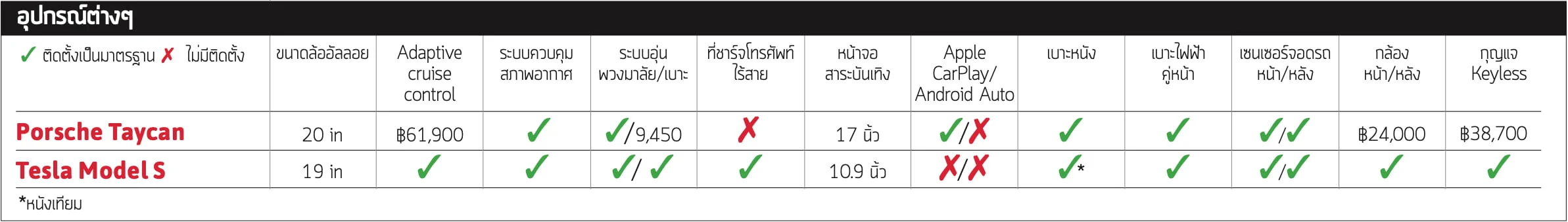 แม้ว่า Model S จะมาพร้อมกับสายเคเบิลทั้งหมดที่คุณต้องการ แต่ Porsche ต้องจ่ายเงินเพิ่ม 210 ปอนด์หรือราว ๆ 10,500บาท เพื่อสาย Type 2 ซึ่งคุณจำเป็นต้องใช้ในการชาร์จ ซึ่งเห็นได้ชัดว่า Model S มีอุปกรณ์ที่ดีกว่าโดยทั่วไป รถทั้งสองคันมีระบบควบคุมความเร็วคงที่แบบปรับได้และเบาะนั่งแบบปรับความร้อนได้รอบด้าน Tesla ได้เพิ่มกระจกมองข้างพับได้ระบบไฟฟ้าและพวงมาลัยแบบปรับความร้อนได้