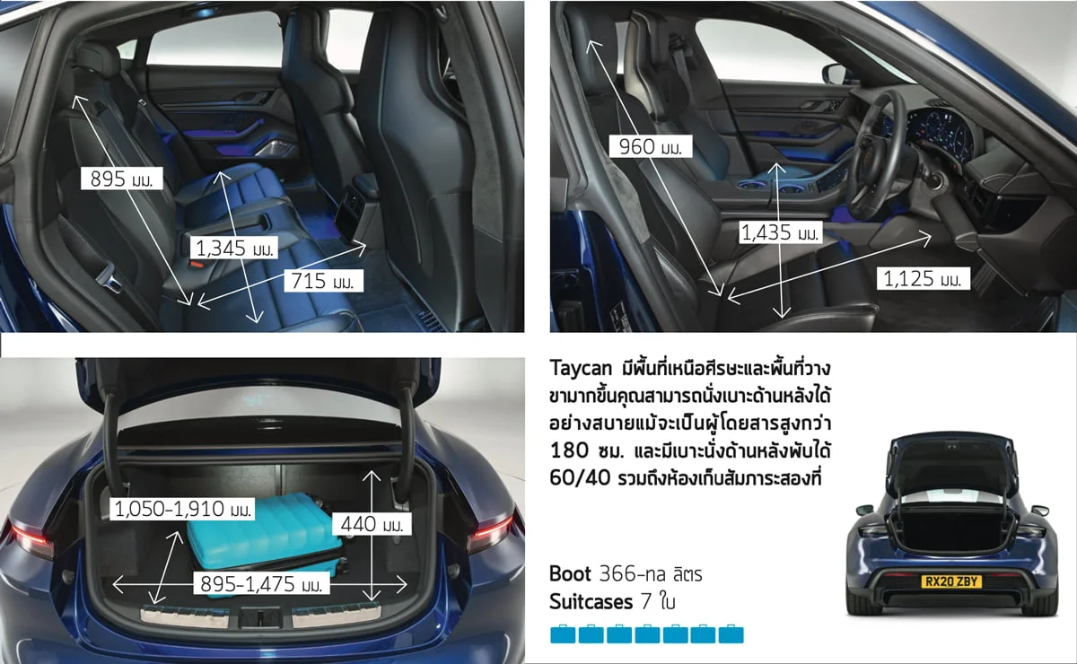ที่นั่งของ Taycan มีขนาดพอดีสำหรับผู้ใหญ่ 2 คน แต่มีพื้นที่เหลือไม่มากนัก ซึ่งคุณสามารถเลือกใช้เบาะแบบ threeseat แทนเบาะนั่งสองตัวที่เป็นมาตรฐานของรถได้ แต่เราคิดว่าน่าจะคับแคบเกินไปสำหรับผู้โดยสารตรงกลาง