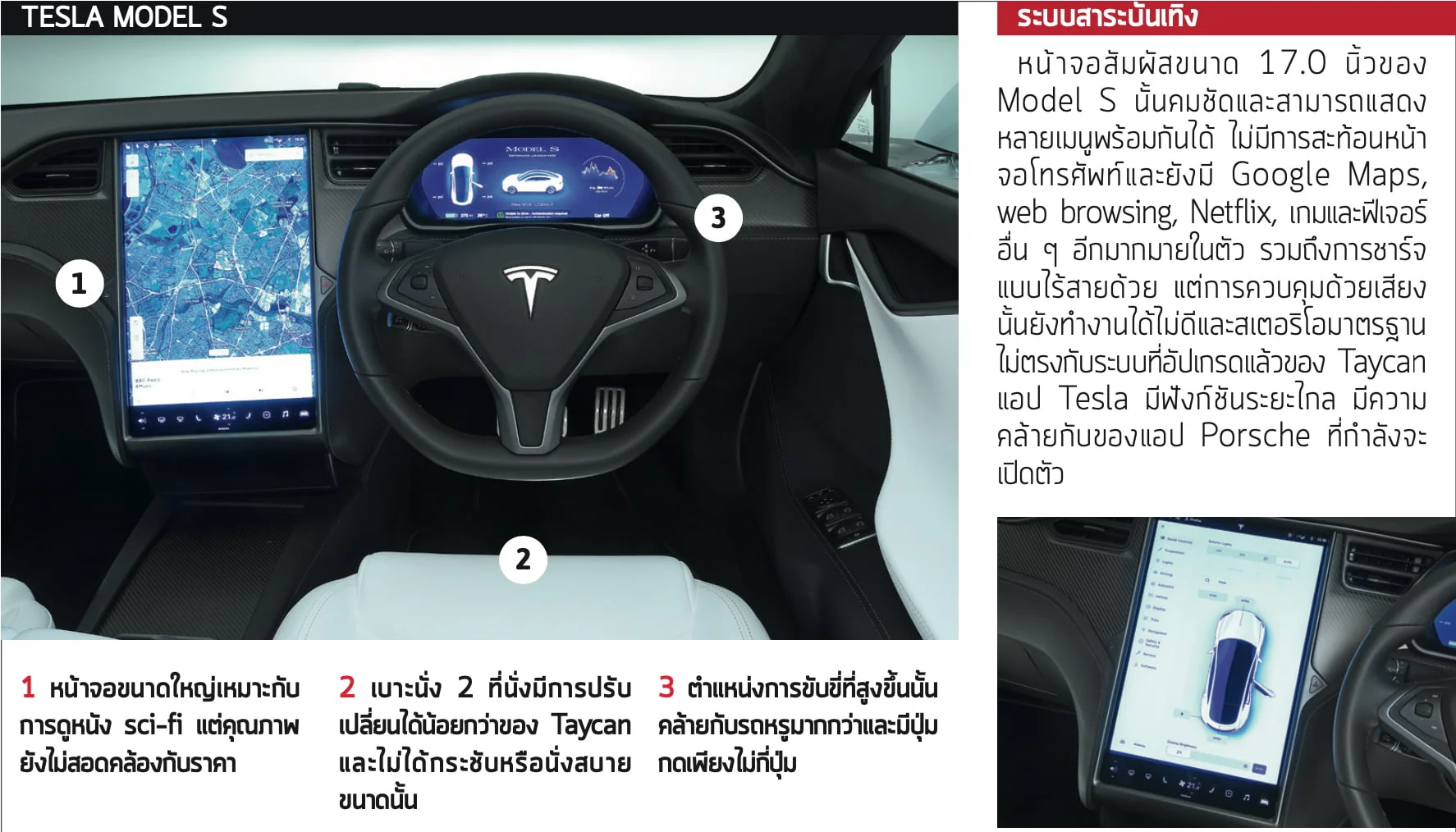 รถทั้งสองคันมีพวงมาลัยแบบปรับไฟฟ้า ด้านหลังเป็นจอแสดงผลแบบดิจิตอล ใน Taycan ใช้การควบคุมฟีเจอร์ต่าง ๆ ผ่านหน้าจอขนาด 8.4 นิ้ว ตรงกลางและหน้าจอสาระบันเทิงที่ติดอยู่ด้านบนขนาด 10.9 นิ้ว รถทั้งสองคันไม่มีปุ่มมากมายนั่นอาจจะเป็นเรื่องยากไปหน่อยสำหรับการค้นหาเมนูต่าง ๆ ถึงแม้ Tesla จะเป็นหน้าจอขนาดใหญ่ 17.0 นิ้วก็ตาม