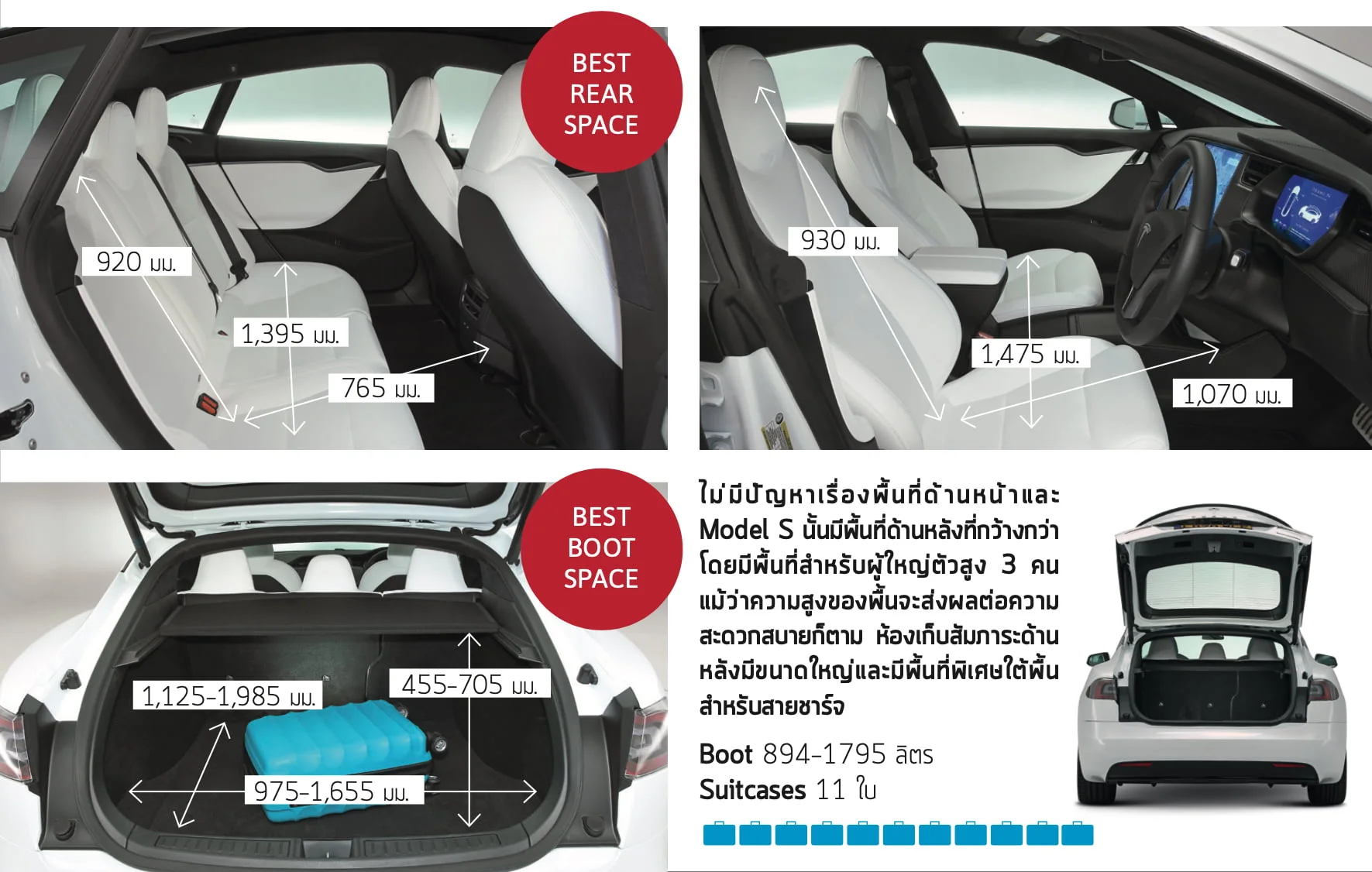 อย่างไรก็ตาม Model S ชนะเรื่องพื้นที่ด้านหลังแม้ว่าผู้โดยสารสูงกว่า 180 ซม. ทั้ง 3 คน จะนั่งได้อย่างไม่มีปัญหามากนัก แล้วก็น่าเสียดายอีกที่พื้นค่อนข้างสูงเมื่อเทียบกับที่นั่ง นี่จึงเป็นสาเหตุที่ทำให้ Model S พลาดตำแหน่งนี้