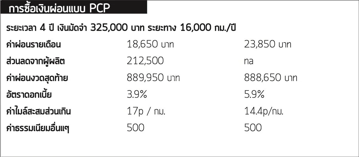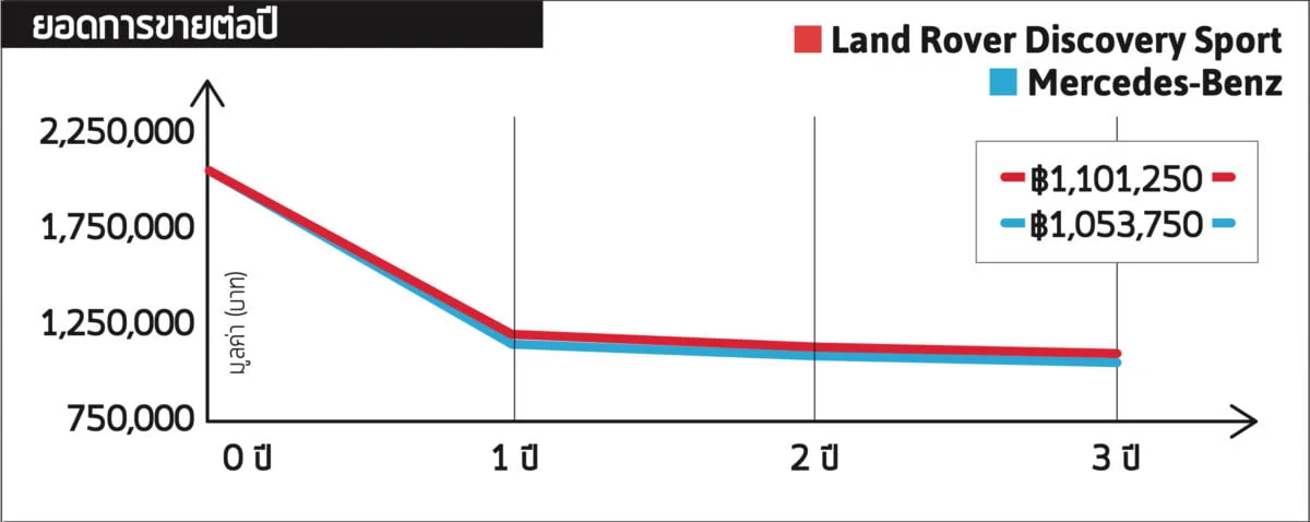 Discovery Sport ยังมีราคาถูกกว่าหากคุณเลือกการชำระเงินผ่านระบบผ่อนแบบ PCP หากวางเงินดาวน์ 6,500 ปอนด์ (325,000 บาท) และเลือกระยะเวลาผ่อน 4 ปี จำกัดการวิ่งไม่เกินปีละ 10,000 กม.ต่อปี โดยคุณจะมีภาระผ่อน 373 ปอนด์ (18,650 บาท) ต่อเดือน น้อยกว่า GLB 104 ปอนด์ (5,200 บาท) หากคุณจ่ายภาษี 40%