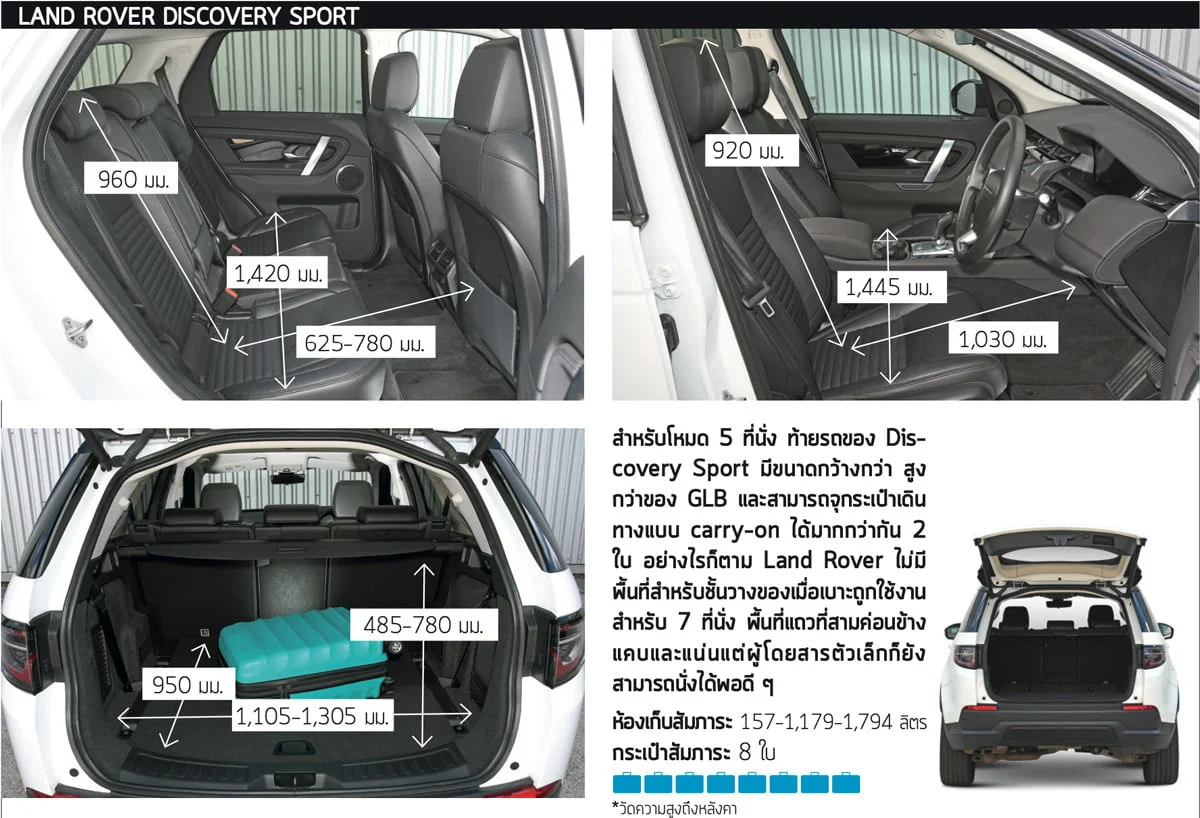หากคุณมีร่างกายกำยำใหญ่โตเหมือนนักบาสเก็ตบอล เราจะไม่สนับสนุนให้คุณติดตั้งหลังคากระจกพาโนรามา บน Discovery Sport แต่ผู้โดยสารสูง 180 ซม. ก็ยังสามารถเข้าไปนั่งใต้หลังคากระจกแบบนี้ได้อย่างพอดี ที่จริงแล้วพวกเขาจะยังมีพื้นที่เหนือศีรษะเหลือมากมายหากนั่งเบาะด้านหน้าของรถยนต์ทั้งสองรุ่น แม้ว่า GLB จะมีพื้นที่มากกว่า ถึงอย่างนั้นรถยนต์ทั้งสองรุ่นมีพื้นที่เก็บสิ่งของด้านหน้ามากมาย รวมถึงที่วางแก้วที่ลึกและกระชับพอดี