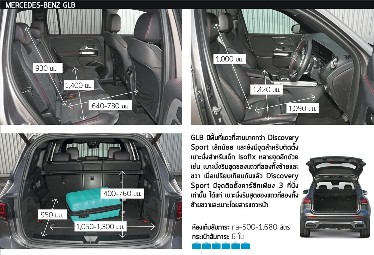 เมื่อมาพิจารณาแถวที่สองของ Discovery Sport ดูจะนั่งสบายมากกว่า มันมีความกว้างและสามารถรองรับผู้โดยสารสามคนได้อย่างสบาย ๆ อีกทั้งยังมีพื้นที่เหนือศีรษะเหลือเพียงพอสำหรับผู้โดยสารตัวสูง เพราะที่นั่งแถวที่สองสูงขึ้นกว่าด้านหน้าเพียงเล็กน้อยเท่านั้น สำหรับ GLB กลับมีตำแหน่งสูงกว่ามาก อย่างไรก็ตามข้อดีของความสูงนี้คือ เด็ก ๆ จะได้ชมวิวทิวทัศน์ด้านหน้าและด้านข้างบ้าง และยังสามารถช่วยลดอาการเมารถได้อีกด้วย