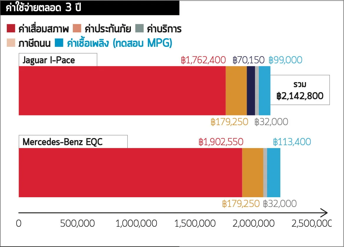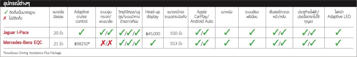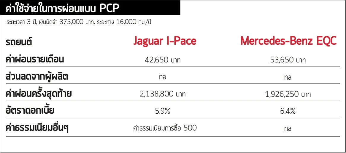 สำหรับ I-Pace นั้นเร่งได้เร็วกว่า มีอุปกรณ์ครบครันพอกันแต่มีพื้นที่หลังคนขับมากกว่า ขับขี่สนุกตื่นเต้น โดยภาพรวมก็เป็นรถยนต์ไฟฟ้าที่นุ่มสบายมากกว่า และหากพิจารณาค่า PCP ก็จะพบว่าต่ำกว่า EQC ดังนั้นจะห้ามไม่ให้ชนะก็ทำไม่ได้จริงๆ