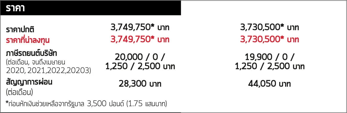 ภาษีรถบริษัทของทั้ง 2 รุ่นแทบไม่ต่างกัน ไม่มีส่วนลดด้วยกันทั้งคู่ และมีราคาซื้อเงินสดต่างกันไม่กี่ร้อยปอนด์ ข้อดีคือทั้ง 2 รุ่นจะได้รับเงินช่วยเหลือจากรัฐบาล 35,000 ปอนด์ (ราว 1,750,000 บาท) อย่างไรก็ราคาจะเปลี่ยนจากหน้ามือเป็นหลังมือหากคุณกำลังพิจารณาการซื้อเงินผ่อนแบบ PCP 3 ปี