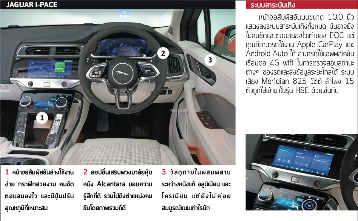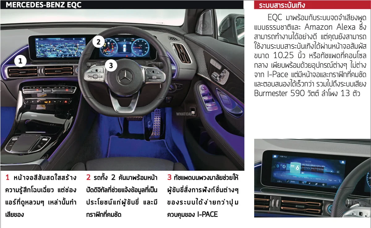 ปัจจุบันมีผู้แข่งขันหน้าใหม่เข้ามาในเส้นทางรถยนต์ไฟฟ้ามากมาย สองเดือนที่แล้ว Jaguar I-Pace ถูกท้าทายด้วย Tesla Model 3 แต่ก็มีเหตุผลบางประการที่ I-Pace เหนือกว่า ประการแรกคือ I-Pace อยู่อันดับที่ 2 ในการทดสอบ Real Range ของเราโดยสามารถวิ่งได้ไกลถึง 400 กม. ต่อการชาร์จไฟหนึ่งครั้ง ประการที่สองคือรถรุ่นนี้ยังเป็นเอสยูวีไฟฟ้าที่สร้างความประทับใจแก่เรามากกว่า Audi E-tron และ Tesla Model X มันจึงเป็นหนึ่งในตัวเลือกแห่งอุดมคติที่สามารถต่อกรกับรถยนต์ไฟฟ้ารุ่นใหม่อย่าง Mercedes-Benz EQC เราทดสอบทั้งคู่ในรุ่นท็อปและพวกมันก็มีราคาไม่ต่างกันมาก EQC มาพร้อมกับมอเตอร์ไฟฟ้าที่เพลาแต่ละอัน ทำให้มันเป็นรถขับเคลื่อนสี่ล้อ อีกทั้งมอเตอร์ทั้งหมดก็มอบขุมพลังรวม 402 แรงม้า มากกว่า I-Pace ที่มี 394 แรงม้า แต่แบตเตอรี่จะมีเล็กกว่า (80kWh ต่อ 90kWh) และระยะทางขับขี่ต่อการชาร์จหนึ่งครั้งน้อยกว่า I-Pace อยู่ 50 กม.