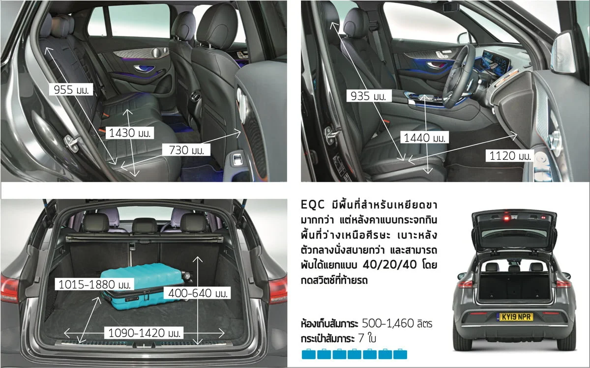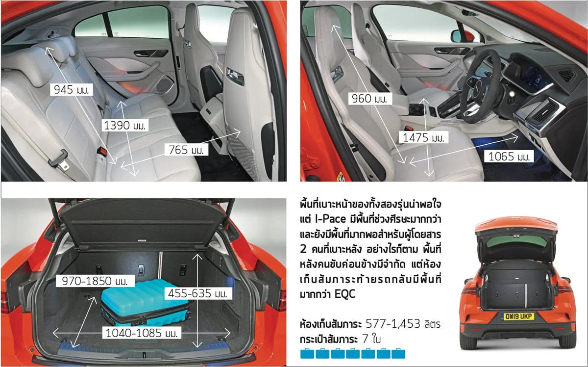 EQC รุ่น AMG Line Premium Plus มาพร้อมกับหลังคาซันรูฟแบบอัตโนมัติ ซึ่งมันยอดเยี่ยมแต่ทำให้พื้นที่เหนือศีรษะมีน้อยกว่า I-Pace ทั้งนี้ คุณยังคงมีพื้นที่สำหรับศีรษะและเหยียดขาอย่างเพียงพอ และสำหรับ EQC มาพร้อมกับพื้นที่เหยียดขาที่มากกว่า รถยนต์ทั้ง 2 รุ่นพยายามนำเสนอความสามารถในการจุสัมภาระทั้งด้านในและท้ายรถ
