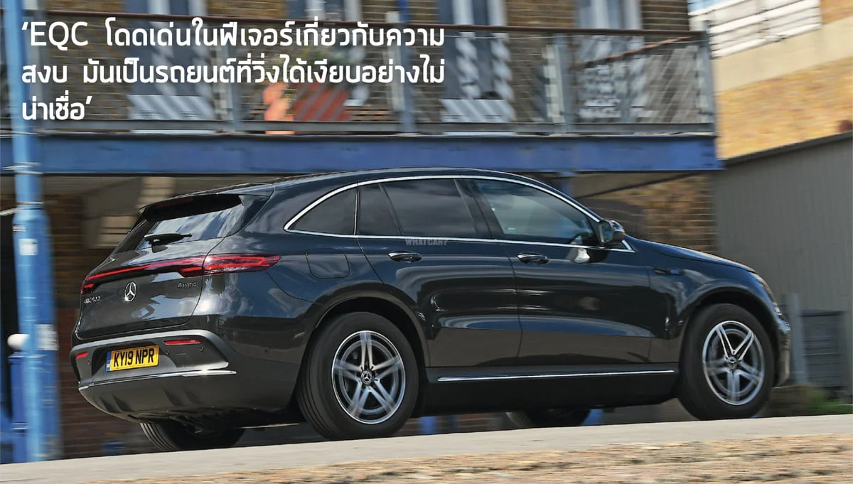 ฟีเจอร์ที่โดดเด่นของ EQC คือ ความเงียบอันน่าทึ่ง เป็นผลมาจากการทำงานของมอเตอร์ที่ราวกับอยู่ในระบบสุญญากาศ ไม่มีแม้กระทั่งเสียงล้อเบาๆ ในขณะที่ทำความเร็ว 110 กม./ชม. แต่มีเพียงเสียงลมหวิวๆ ผ่านกระจกเข้ามาเล็กน้อยเท่านั้น แม้กระทั่งขณะเบรกซึ่งมักจะเป็นปัญหาที่พบในระบบรถยนต์ไฟฟ้า เพราะขณะเบรกต้องมีการส่งพลังงานไฟฟ้ากลับไปชาร์จเแบตเตอรี่ในระหว่างที่รถชะลอตัวซึ่งสามารถคาดการณ์ได้ 90% สิ่งเดียวที่สร้างเสียงรบกวนคือเสียงช่วงล่างขณะที่คุณขับบนเนินหรือหลุมบ่อ