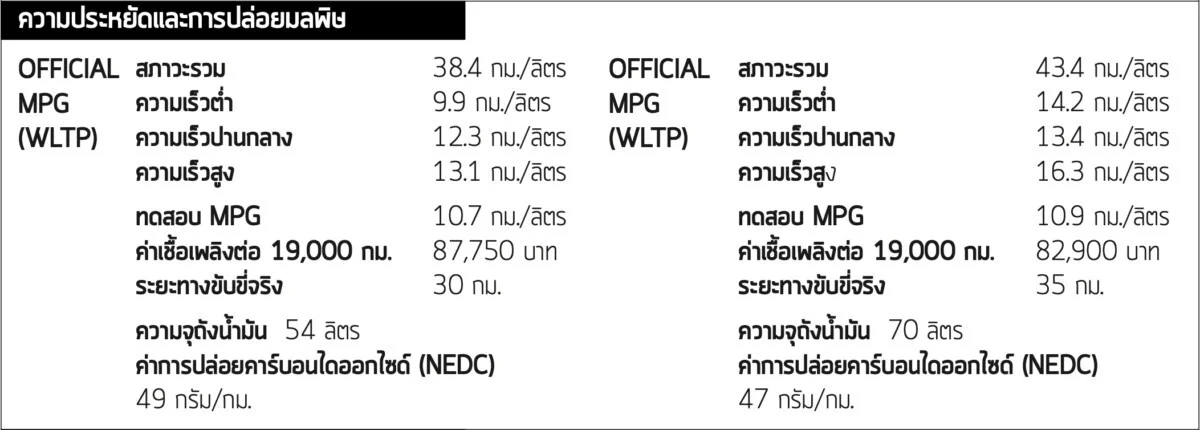 แม้ว่ารถเหล่านี้จะมีตัวเลขอัตราสิ้นเปลืองเฉลี่ยอย่างเป็นทางการมากกว่า 35.4 กม. แต่ผู้คนส่วนใหญ่จะไม่สามารถพบกับตัวเลขนี้ได้ถ้าหากพวกเขาไม่เดินทางเป็นระยะสั้นๆ และชาร์จแบตเตอรี่ทุกครั้งหลังเดินทาง ในการทดสอบของเรา หากไม่วิ่งด้วยระบบไฟฟ้าเลย รถทั้ง 2 คันจะมีค่าเฉลี่ยที่ราว 10.6 กม./ลิตร ซึ่งก็ไม่เลวนักถ้าดูจากขนาดและสมรรถนะของพวกมัน