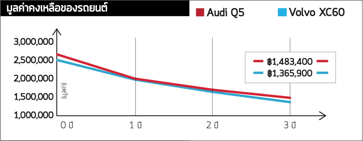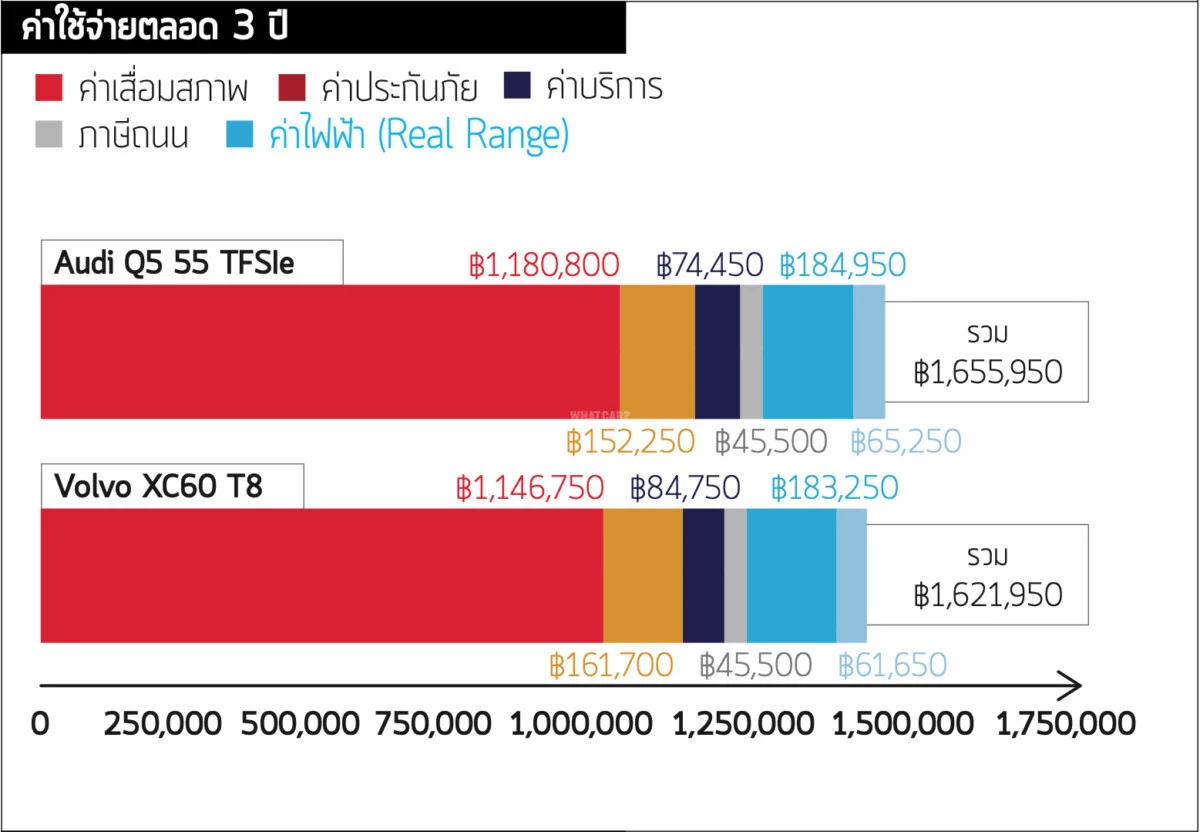 ไม่น่าแปลกใจที่คุณจะได้รับส่วนลดมากกว่าใน XC60 เนื่องจาก Q5 Plug-in Hybrid เป็นรุ่นใหม่ อย่างไรก็ตามค่าเสื่อมราคาใน Q5 น่าจะช้ากว่า มันจึงทำให้ผู้ซื้อรถส่วนตัวมีค่าใช้จ่ายน้อยกว่าใน 3 ปีแรก