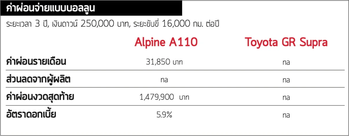 เราไม่สามารถสรุปค่าใช้จ่ายในการเป็นเจ้าของตลอดระยะเวลา 3 ปีรวมเงื่อนไขการผ่อนแบบ PCP ของ Supra ได้ แต่เราสามารถบอกคุณได้ว่าในการผ่อนแบบ PCP, A110 มีค่างวดต่อเดือน 31,850 บาท และด้วยเครื่องยนต์ที่ใหญ่กว่า Supra จึงใช้เชื้อเพลิงมากกว่าด้วย