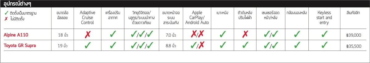 รถทั้งสองคันมาพร้อมกับอุปกรณ์ที่เหมาะสม อาทิ เบาะหนัง, เครื่องปรับอากาศ, ล้ออัลลอย, และไฟหน้า LED ไฟหน้าของ Supra ปรับได้และมันยังมีอะแด็ปทีฟครูสคอนโทรล, เบาะนั่งปรับความร้อนและความเย็น และ Head-up display ในบรรดาอุปกรณ์เหล่านี้ A110 มีเพียงเบาะนั่งความร้อนเท่านั้น