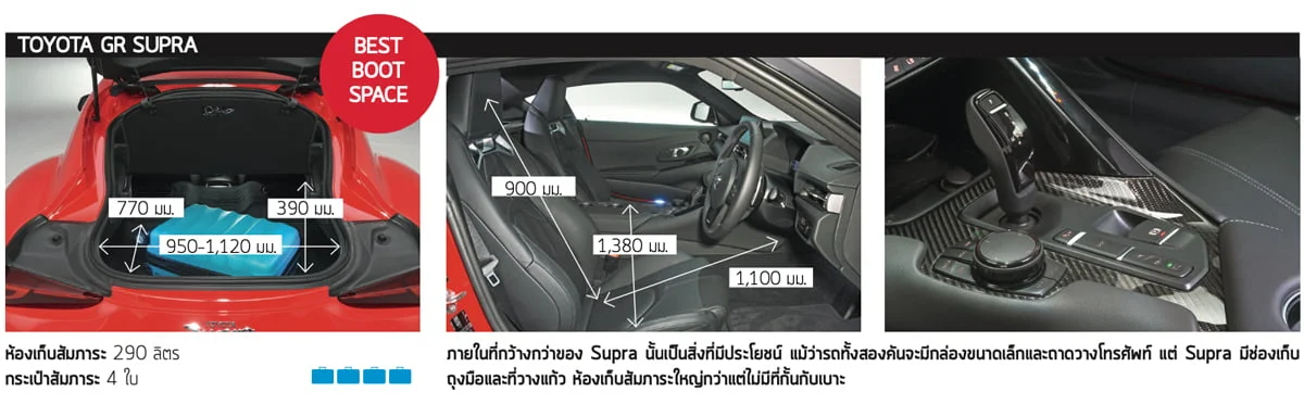 A110 อาจมีสัดส่วนที่ค่อนข้างเล็กแต่มันมีพื้นที่ภายในสะดวกสบายสำหรับคนสูง 6 ฟุตสองคน Supra มีพื้นที่วางเท้ามากกว่า ไม่มีคันไหนที่มีช่องเก็บของที่น่าประทับใจ แต่อย่างน้อย Supra ก็มีช่องเก็บถุงมือและที่วางแก้วซึ่ง A110 ไม่มี