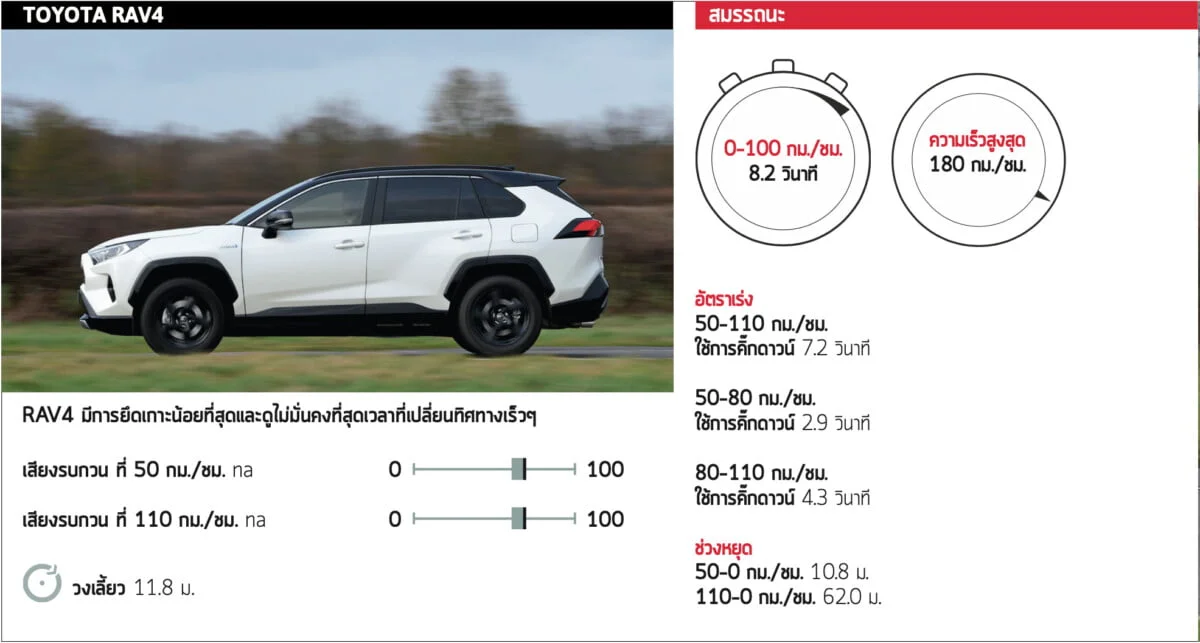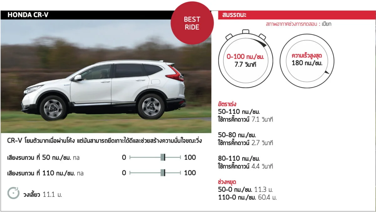 รถทั้งสามรุ่นมีเสียงยางบนทางด่วนที่ชัดเจน มันยังดังกว่า SUV ขนาดใหญ่ที่ดีที่สุดอีกด้วย แม้ว่า RAV4 จะแย่ที่สุดในแง่นี้ ขณะเดียวกัน CX-5 นั้นแย่ที่สุดในเรื่องเสียงลม ดังนั้น CR-V จึงเป็นรถที่มีเสียงรบกวนเบาที่สุด