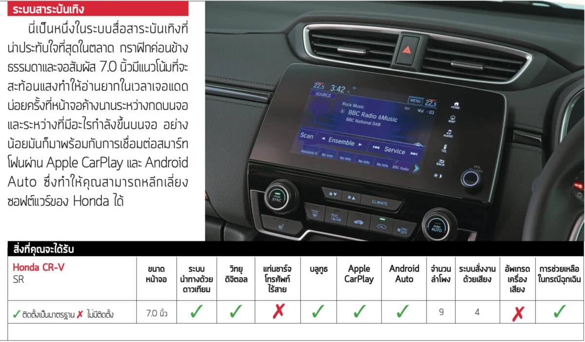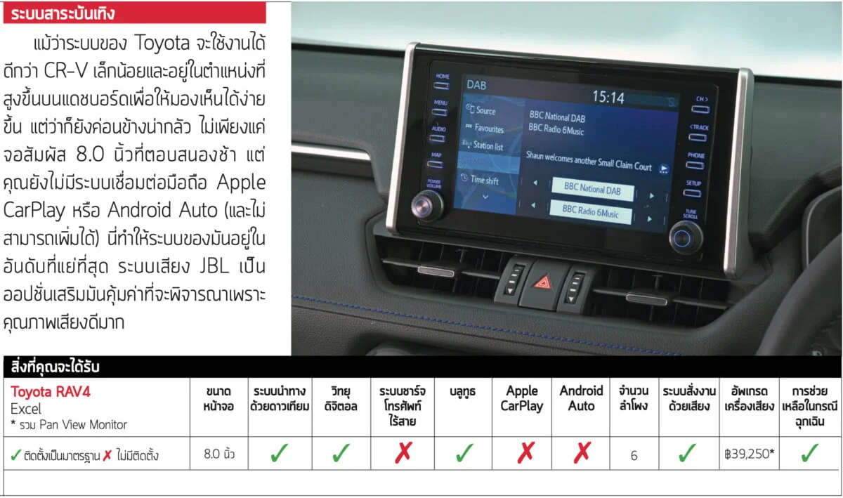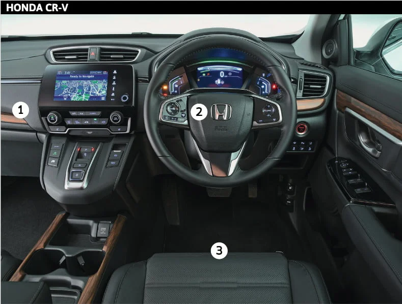 CX-5 และ RAV4 มีการจัดวางแดชบอร์ดที่เหมาะสม ปุ่มและสวิตช์บนพวงมาลัยก็ชัดเจน แต่ไม่เป็นเช่นนั้นใน CR-V ปุ่มควบคุมของระบบ Trip Computer และ Adaptive Cruise Control นั้นไม่ได้ใช้งานง่ายเลย เราพนันได้ว่าหากคุณไม่ดูคู่มือ คุณจะไม่มีทางใช้มันได้