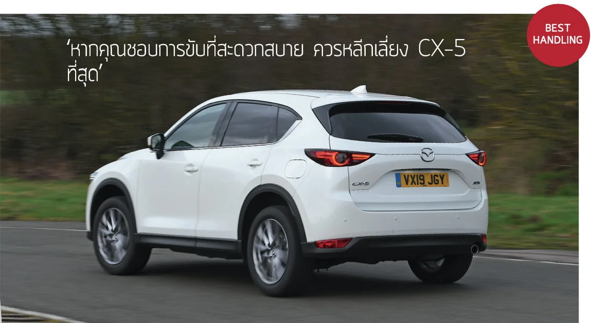 3 เบาะหน้าของ CX-5 ช่วยยึดคุณให้อยู่บนจุดที่ปลอดภัยที่สุดเมื่อผ่านโค้ง มันเป็นรถคันเดียวที่เบาะผู้โดยสารปรับไฟฟ้า