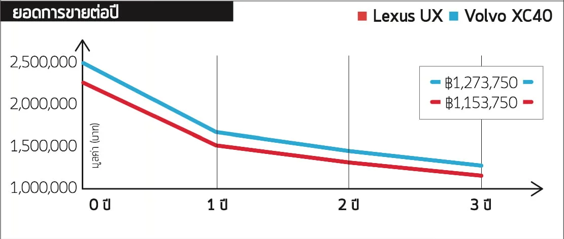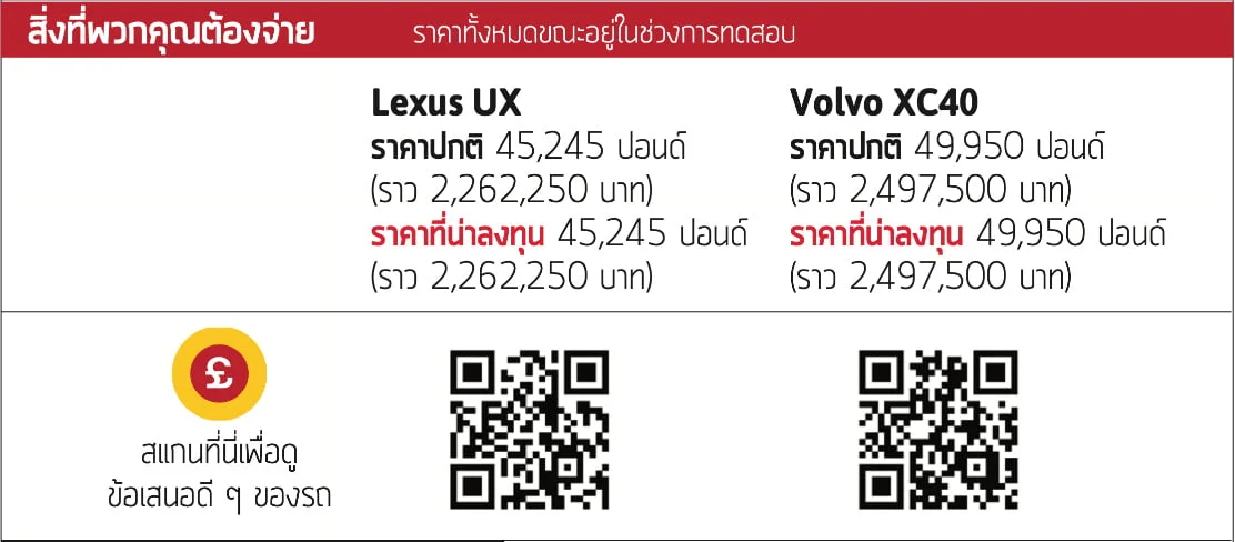 ไม่มีรถใดเข้าเกณฑ์สำหรับเงินช่วยเหลือ EV มูลค่า NaN เพราะทั้งสองคันมีราคามากกว่า 1,750,000 บาท ซึ่ง UX 300e เริ่มต้นที่ 2,087,250 บาท แต่เราขอแนะนำให้พิจารณารุ่น Premium Plus Pack ที่เราใช้ทดสอบ ในส่วนของ XC40 มีราคาแพงกว่าหากคุณซื้อด้วยเงินสดทันทีและเราได้ทดลองขับรุ่นที่ถูกที่สุด