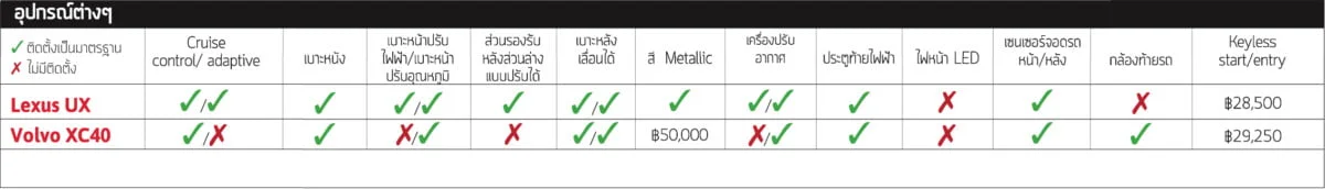 เมื่อพูดถึงอุปกรณ์ XC40 นั้นมาพร้อมกับสิ่งอำนวยความสะดวกต่าง ๆ เช่น ระบบควบคุมความเร็วอัตโนมัติ ระบบควบคุมสภาพอากาศ ระบบเข้า-ออกแบบไม่ใช้กุญแจ การชาร์จโทรศัพท์แบบไร้สาย ไฟส่องสว่างโดยรอบ และไฟหน้า LED การตกแต่งภายในด้วยหนัง ราคา 32,500 บาท นั้นคุ้มค่าที่จะเพิ่ม แต่คุณต้องเลือกใช้ Plus trim เพื่อรับกล้องมองหลังและเบาะปรับอุณหภูมิได้ แต่มีเฉพาะรุ่น Pro ที่มีราคาแพงมากเท่านั้นที่ได้รับการควบคุมความเร็วอัตโนมัติแบบปรับได้ ซึ่ง UX มีอุปกรณ์ครบครันมากกว่า โดยเพิ่มเบาะนั่งแบบปรับอุณหภูมิได้ เบาะหนัง ระบบควบคุมความเร็วอัตโนมัติแบบปรับได้และกล้องถอยหลังที่เรากล่าวถึงก่อนหน้านี้