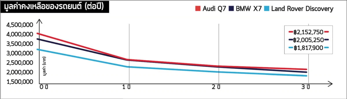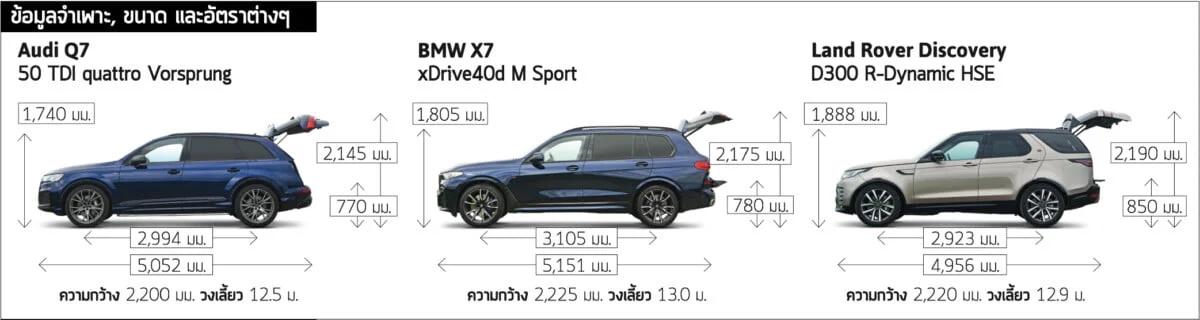 หากคุณมีผู้โดยสารที่เป็นผู้ใหญ่นั่งแถวที่ 3 เป็นประจำ ใน X7 จะตอบโจทย์ที่สุดด้วยพื้นที่เหนือศีรษะที่กว้างพื้นที่วางขามากที่สุดและเบาะนั่งที่สบายที่สุดทำให้การเดินทางที่ยาวนานเป็นที่น่าพึงพอใจ การปีนไปนั่งแถวที่สามของ Discovery นั้นยากกว่าแต่เมื่อไปถึงที่นั่นแล้วคุณจะพบกับพื้นที่สำหรับวางเข่าในขนาดที่เหมาะสมและมีพื้นที่เหนือศีรษะมากกว่าใน X7 ซึ่งผู้ใหญ่จะชอบมันมากกว่า Q7 ซึ่งแคบที่สุด