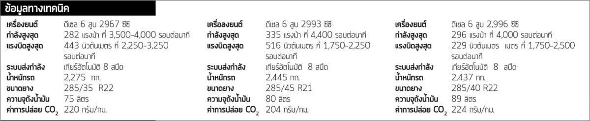 X7 และ Discovery เข้าถึงสมรรถนะเต็มพิกัดได้ค่อนข้างง่ายด้วยระบบเกียร์อัตโนมัติ โดยที่จะทำงานอย่างรวดเร็วและเครื่องยนต์จะเบาลงเกือบจะในทันที ซึ่งกระปุกเกียร์ของ Q7 ตอบสนองได้ช้ากว่าและมีการหยุดชั่วคราวก่อนที่เครื่องยนต์จะส่งพลังงานออกไปและในขณะที่เครื่องยนต์ V6 นั้น มีความหยาบกระด้างซึ่งต่างจาก เครื่องยนต์ของ Discovery ที่เงียบและนุ่มนวลหรือมีเสียงฮึ่ม ๆ เหมือนกับ X7 ซึ่งเป็นเสียงของท่อไอเสียแบบสปอร์ตที่ติดตั้งกับรถยนต์ที่เราทดสอบ (M Sport Pro Pack ราคา 119,750 บาท) ใน Q7 มีเสียงรบกวนจากท้องถนนมากกว่า X7 เล็กน้อย ในขณะที่ Discovery นั้นค่อนข้างดังกว่าทั้งคู่แต่ทั้งสามมอบการเดินทางที่สงบ