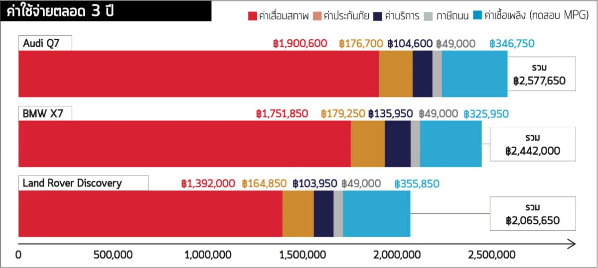 Discovery มีค่าใช้จ่ายน้อยที่สุดในการซื้อและผ่านแบบ PCP รวมถึงอัตราการเช่าต่ำ นอกจากนี้ยังคาดการณ์ว่าจะมีค่าเสื่อมราคาน้อยที่สุดอีกด้วยเมื่อรวมค่าใช้จ่ายที่ผู้ซื้อเงินสดต้องเผชิญในระยะการใช้งานสามปีซึ่งมันจะมีราคาถูกกว่าคู่แข่งอย่างน้อย 375,000 km แม้ว่า Discovery จะใช้น้ำมันมากที่สุด โดยมีอัตรา 12.97 กม./ลิตร ในการทดสอบระยะจริง ตามด้วย Q7 อยู่ที่ 13.31 กม./ลิตร และ X7 ที่ 14.16 กม./ลิตร