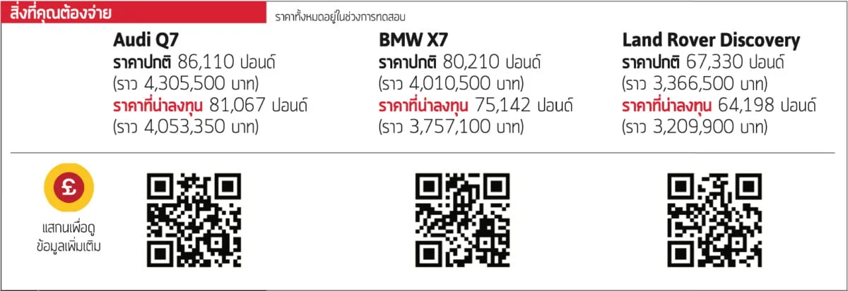 การเป็น SUV ขนาดใหญ่อาจไม่ใช่เรื่องดีเมื่อใช้งานในเมือง แต่ Q7 ขับเคลื่อนแบบสี่ล้อเป็นมาตรฐานเพื่อให้วงเลี้ยวที่แคบ ซึ่งเป็นตัวเลือกที่คุ้มค่าในราคา 59,750 บาท แต่สำหรับ X7 นั้นติดตั้งมากับรถทดสอบของเรา ในขณะที่ Discovery ไม่สามารถใช้งานได้กับระบบดังกล่าว
