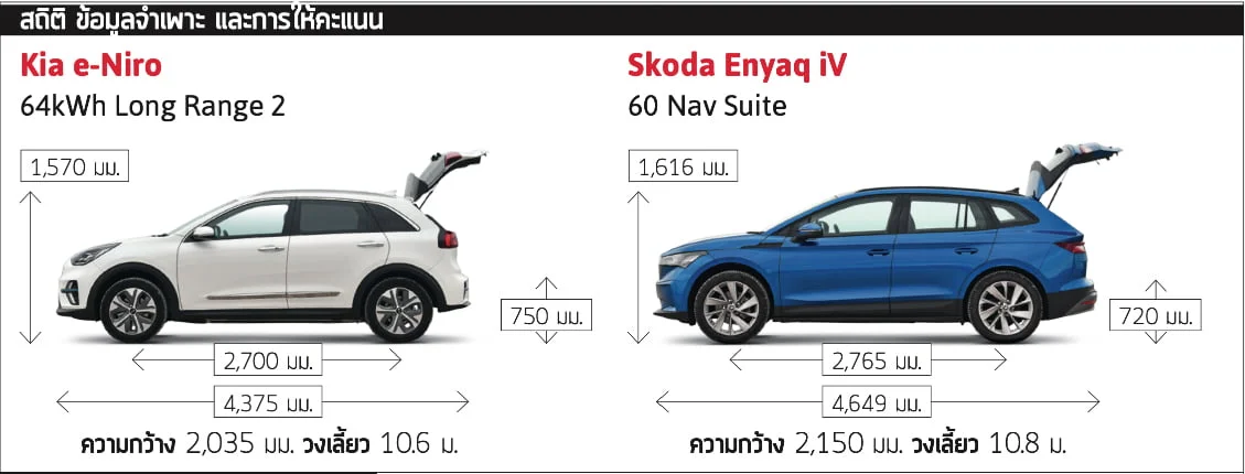พื้นที่ท้ายรถของ Enyaq ทำให้ท้ายของ e-Niro แคบลงไปถนัดตา คุณสามารถขยายพื้นที่บน e-Niro เพิ่มขึ้นได้อีกเล็กน้อยและยังมีพื้นที่ใต้พื้นสำหรับสายชาร์จและเมื่อพับเบาะด้านหลังคุณสามารถขยายพื้นที่ให้เรียบไปจนถึงเบาะหน้าเช่นเดียวกับใน Enyaq นอกจากนี้ Enyaq ยังเพิ่มช่องเก็บสกีแต่เมื่อพับที่นั่งลงจะพบว่าเป็นพื้นต่างระดับซึ่งคุณสามารถเพิ่มแพ็คเกจการขนส่งเสริม (13,000 บาท) ซึ่งจะช่วยให้คุณปรับความสูงของพื้นได้