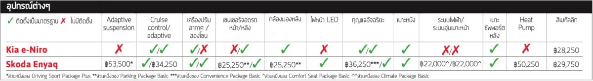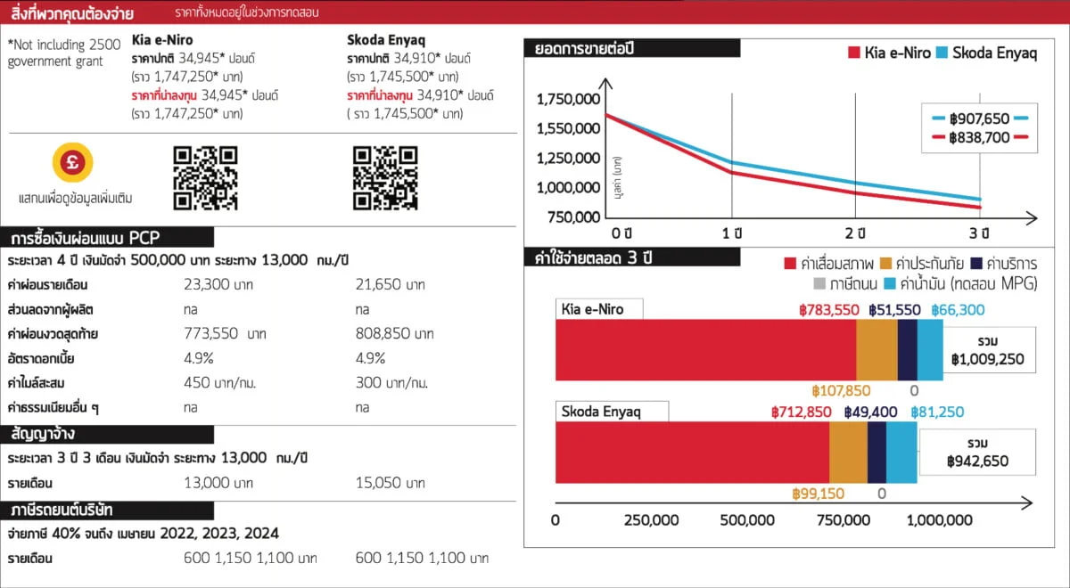คาดว่า Enyaq จะสูญเสียมูลค่าในอัตราที่ช้ากว่า e-Niro เล็กน้อยและมีค่าใช้จ่ายน้อยกว่าด้านการประกันและการบริการ ในระยะการใช้งานสามปี Enyaq จะถูกกว่าถึง 65,000 บาทสำหรับผู้ซื้อเงินสดส่วนตัวเมื่อเทียบกับ e-Niro